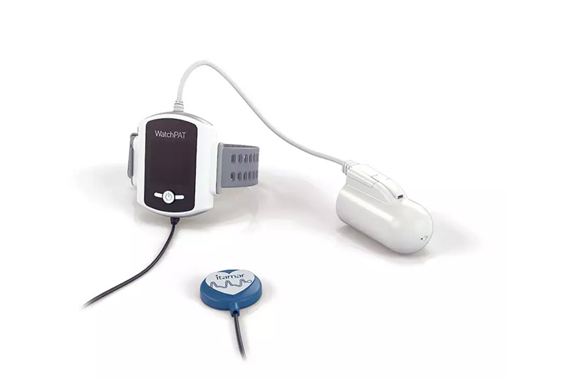 ①クリニックで説明を受ける→②宅配便で自宅に機器が届く→③就寝時に装着→④翌朝機器を外し返送→⑤約10日後に結果説明のため来院。